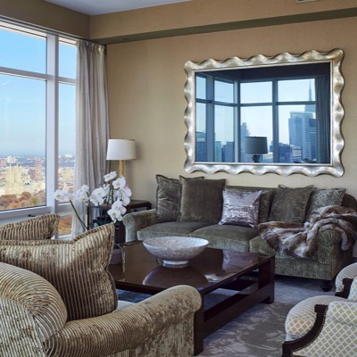 We built out the wall to conceal the very large television behind the mirror. Luminescent wallpaper was used to accent the light and views.