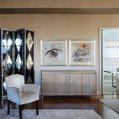 Gilt silver serving buffet for dining area, mirrored folding screen camouflages large air conditioning return.