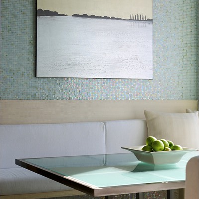 Custom made movable glass table, walls are covered in shimmery glass tiles.