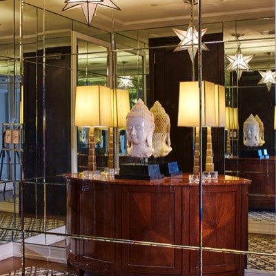 Segmented mirror for space enhancing a small entry that leads to a larger gallery.