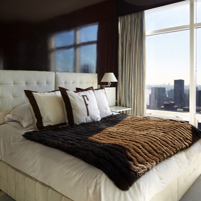 Master bedroom with upholstered silk walls for calming space in a busy city.