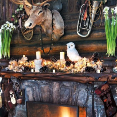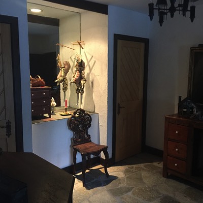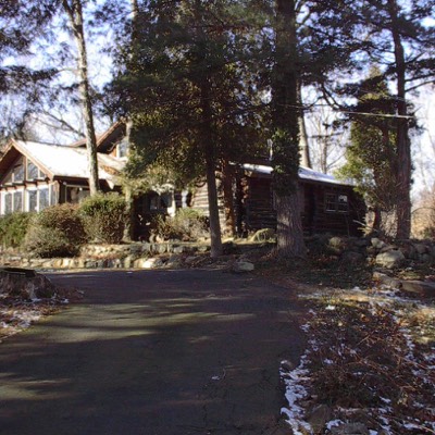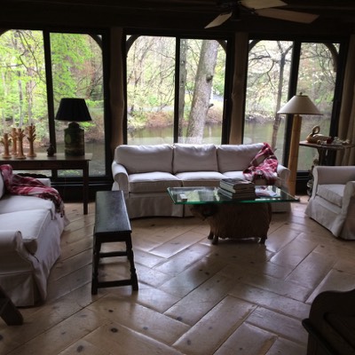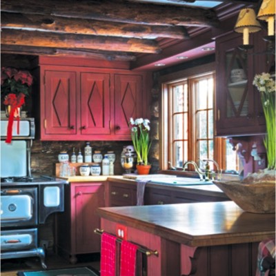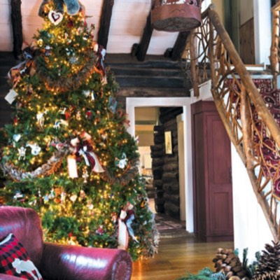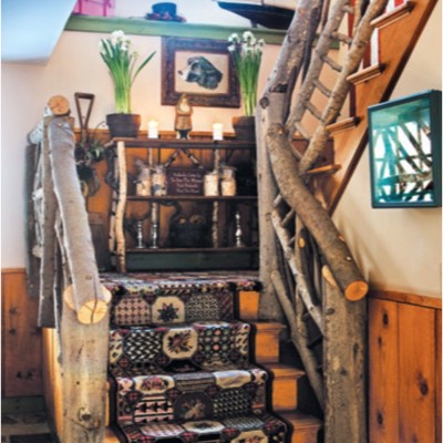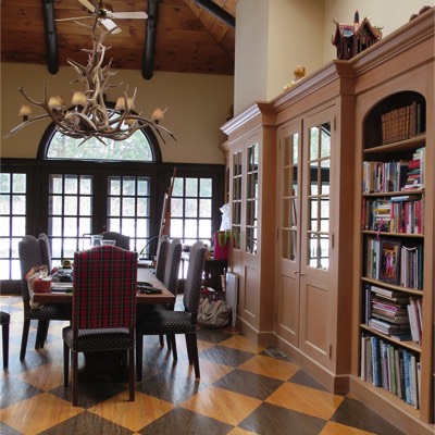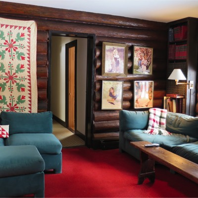 Living room in Beverly’s 100-year-old log hunting lodge.