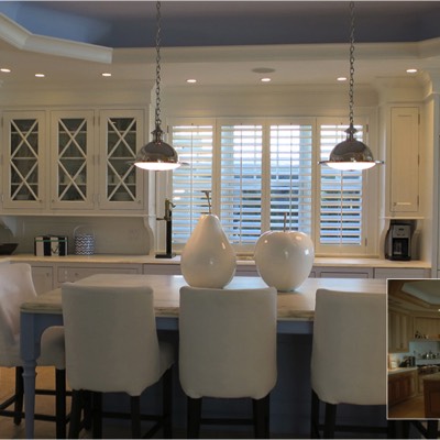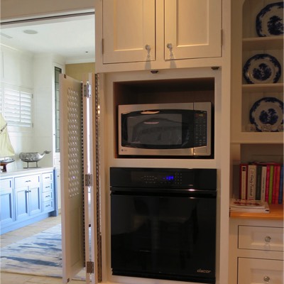 Space was rearranged for better storage and opened up to main living area. Mirrored doors conceal the refrigerator.