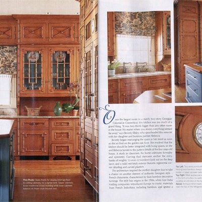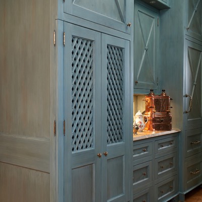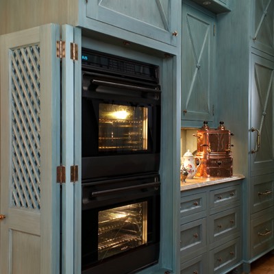 Refrigerator is behind antique mirrored glass doors. We reconfigured large space to make a better layout with less steps.