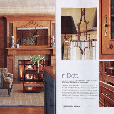 Adjacent family room area uses same bamboo theme for fireplace wall.