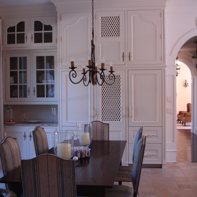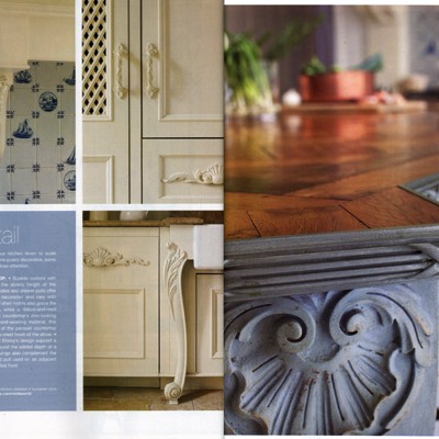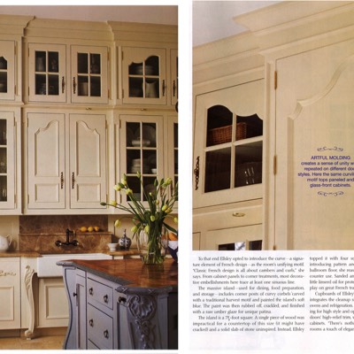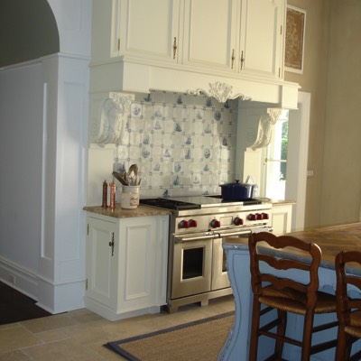 Limestone fireplace designed by Beverly Ellsley Design and fabricated in France. Island countertop is antique walnut parquet.