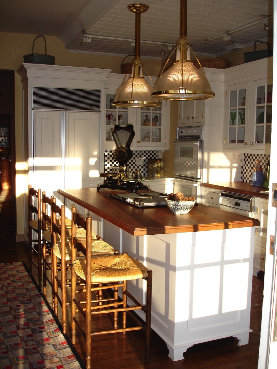 Our classic white kitchen as made in 1987 and shown in our showroom. Still being sold today, designed originally for houses built in the 1920's-40's in our area. Countertops are solid cherry sealed with oil.