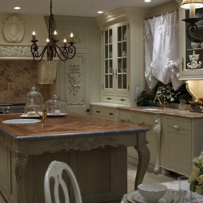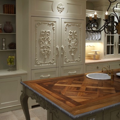Enkeboll Villa Collection woodcarvings designed by Beverly Ellsley is shown in this showhouse kitchen in a NYC townhouse.