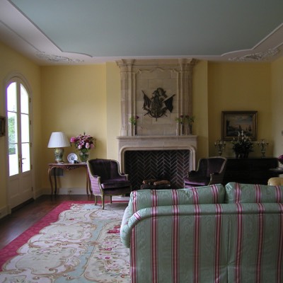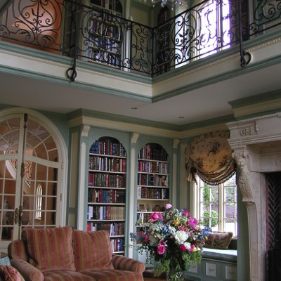 Two story library with antique fireplace imported from France. All cabinetry designed and fabricated by Beverly Ellsley Design.