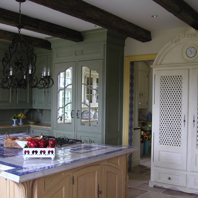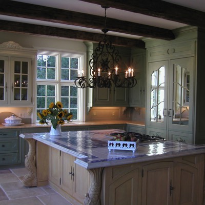 Kitchen with large island. Mirrored doors conceal refrigerator. All cabinets designed and fabricated by Beverly Ellsley Design.