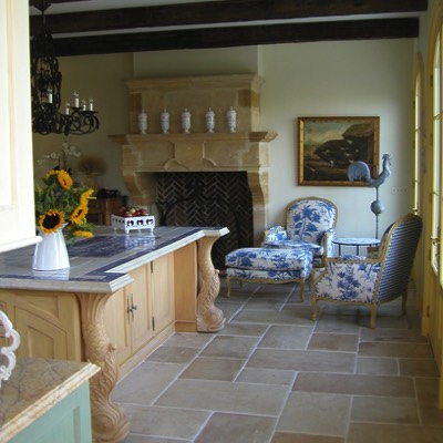Small sitting area near fireplace in kitchen.
