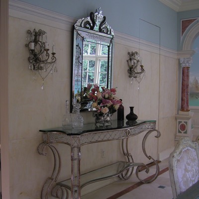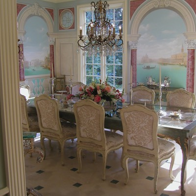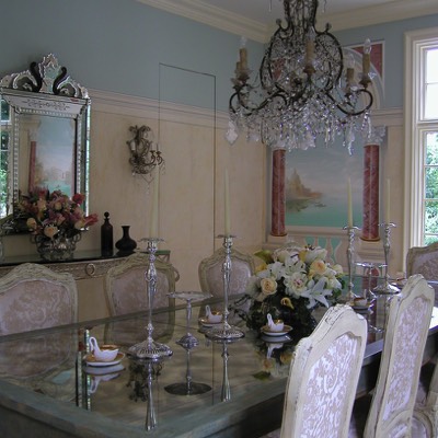 Dining room with custom murals of Venice, custom mirror top dining table.